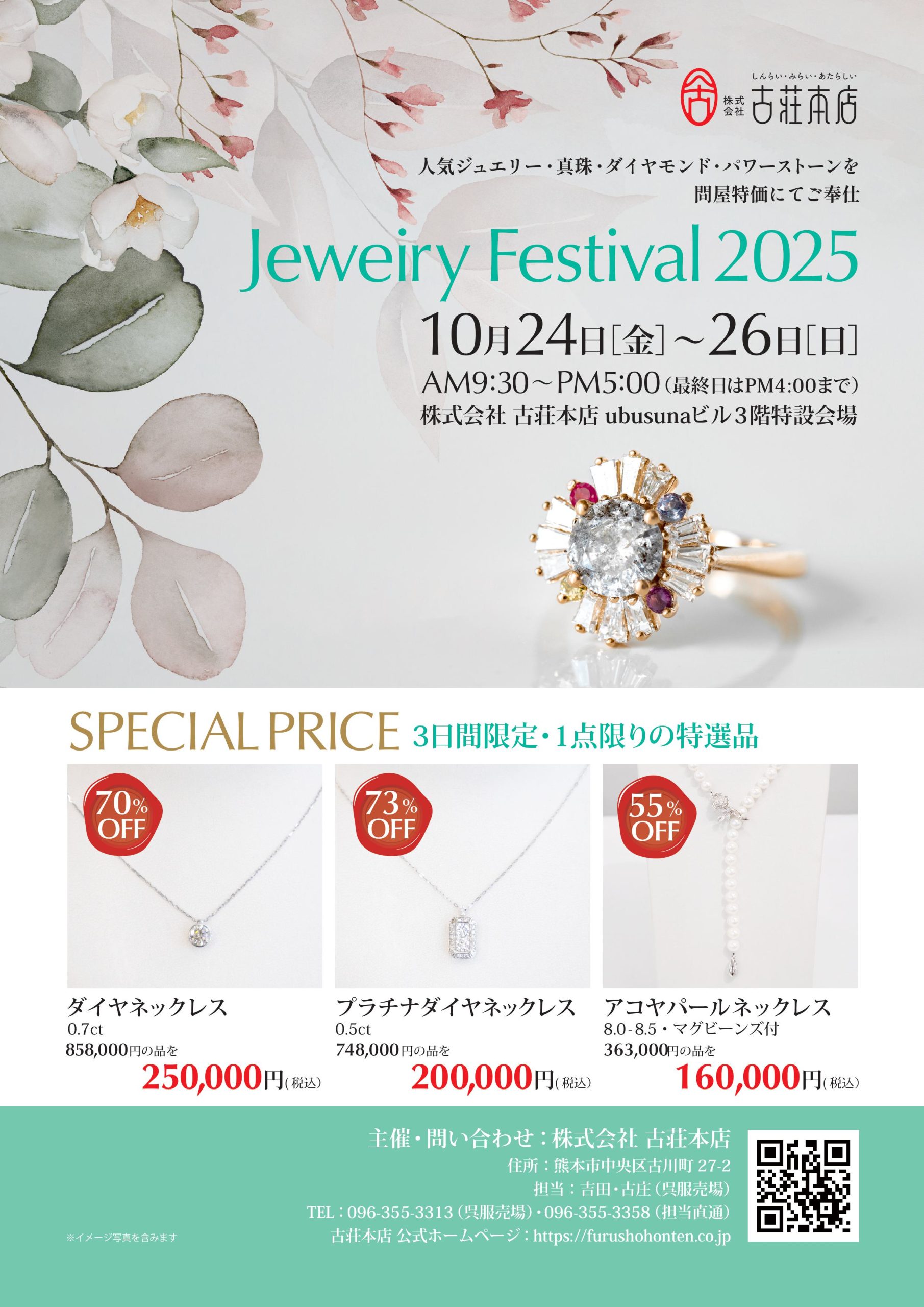 Jeweiry Festival2025開催のお知らせ 公開済み: 2025年10月2日更新: 2025年9月27日カテゴリー: イベント情報タグ: ジュエリー, ダイヤ, ネックレス, パワーストーン, 宝石 Jeweiry Festival2025を開催いたします。 開催日時:2025年10月24日(金)~26日(日) AM9:30~PM5:00(最終日はPM4:00まで) 開催場所:株式会社古荘本店 ubusunaビル3F 皆様のご来場お待ちしております。 関連記事 【新店オープン】STEPアミュプラザくまもと店 弊社が運営する子供服ショップ「STEP」がアミュプラザくまもとにオープンします! プレオープンは4月22日、グランドオープンは4月23日となっております。 ぜひご来店下さい。 STEPアミュプラザくまもと店ではオリジナル […] 公開済み: 2021年4月22日更新: 2021年4月22日カテゴリー: TOPICS, イベント情報 【SDGs取組】古着deワクチンを始めました! 弊社が運営するネイブル宇土店(宇土シティモール2F)にて、不要となった衣料品の収集と再利用を促す「古着deワクチン」を開始しました。 回収された古着はフィリピンの古着deワクチンセンターで輸出前の作業を施され、カンボジア […] 公開済み: 2023年3月16日更新: 2023年3月16日カテゴリー: TOPICS, イベント情報タグ: SDGs, ポリオワクチン, リユース, ワクチン, 古着 まちなかコレクションinKUMAMOTO2019に参加します! まちなかコレクションinKUMAMOTO2019に協賛しています!当社運営のレディースショップ【natura ナトゥーラ】がファッションショーの商品を提供しています!!また、当日はnaturaのブースも出店していますので […] 公開済み: 2019年11月22日更新: 2019年11月25日カテゴリー: イベント情報, 協賛イベントタグ: TGC, まちまかコレクション, レディースファッション, 熊本